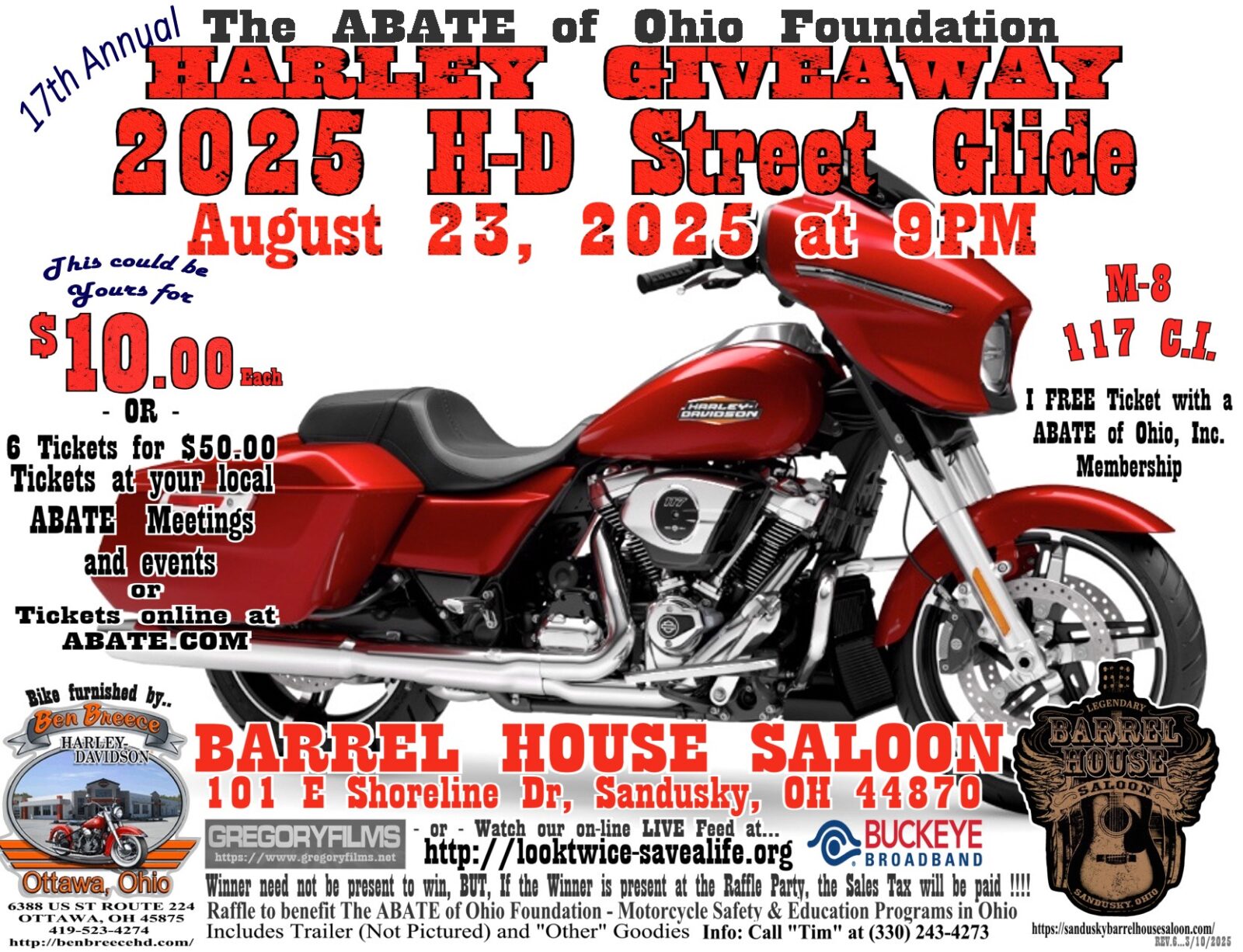 Thanks to the Barrel House Saloon in Sandusky for hosting the event, and thanks to Ben Breece Harley Davidson in Ottawa for furnishing the bike. We'll be back next summer.