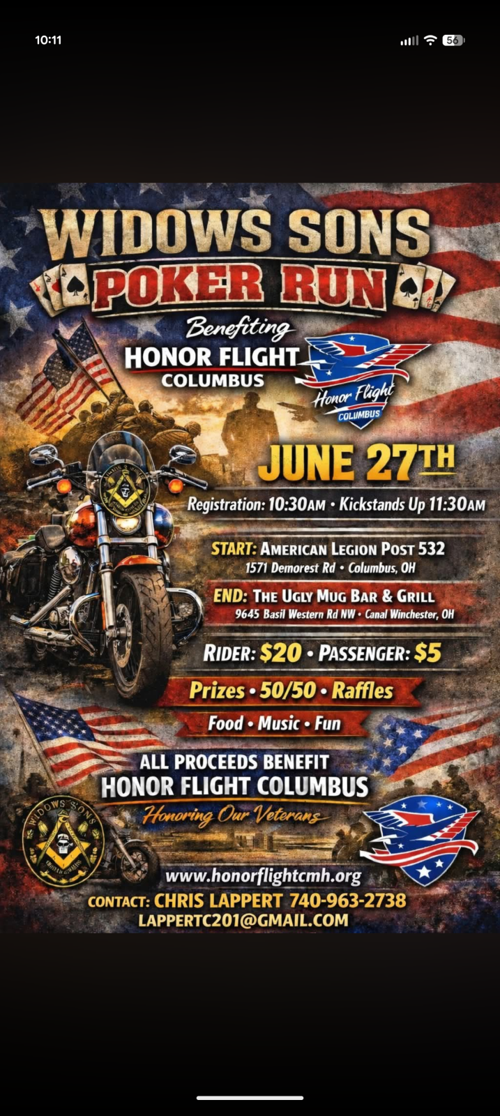 Region 9 is supporting the Widows Sons Masonic RA Middle Chamber chapter and their continued efforts to assist Honor Flight Columbus. Join us for a poker run where all proceeds will go to Honor Flight and the veterans they serve.