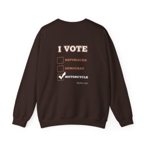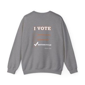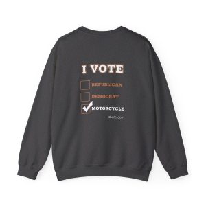 This cozy crewneck sweatshirt carries the bold spirit of the open road. Warm, mid-weight fabric and a classic boxy fit make it a steady companion for chilly rides, weekend garage days, and late-night bonfires. The front showcases a vintage-inspired motorcycle illustration with hand-lettered flair, while the back delivers an “I VOTE” checklist that champions motorcycle culture over political labels. It’s the kind of sweatshirt worn by people who value throttle time. Slip it on after a long ride and feel the soft, familiar weight that holds its shape.